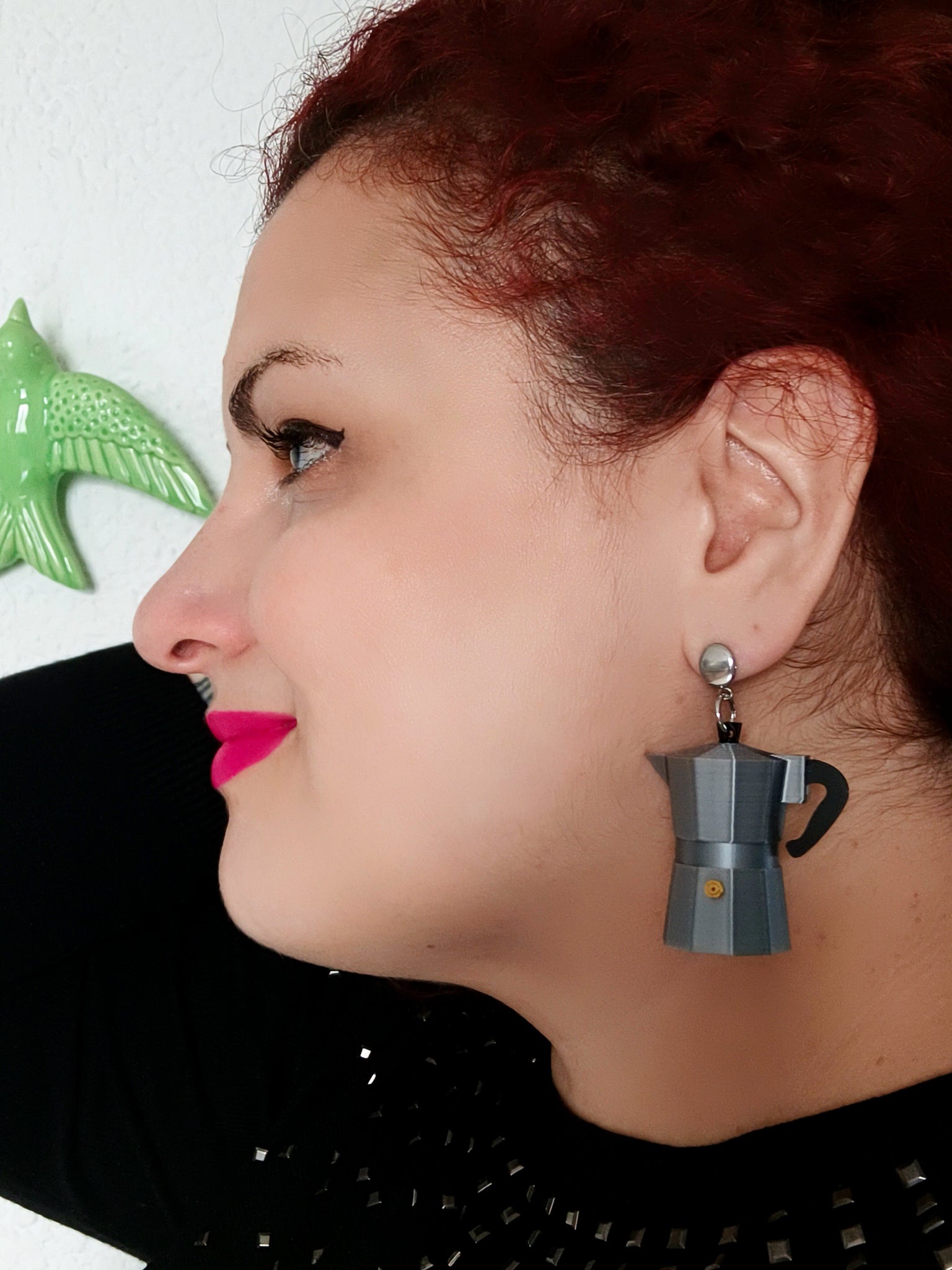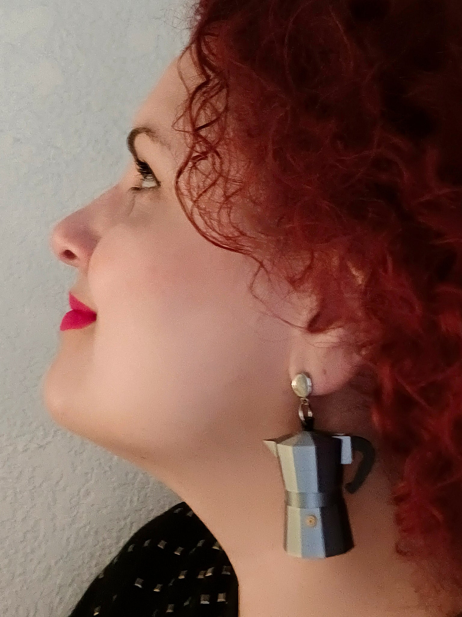 Luce original con estos pendientes en forma de cafeteras italianas impresas en 3D. Están inspirados en los que lleva el personaje de la actriz María Barranco en la película Mujeres al borde de un ataque de nervios de Pedro Almodóvar.