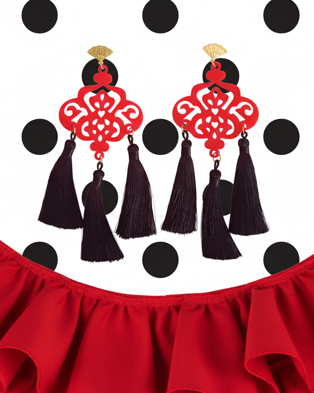- Pendientes de metacrilato rojo, anillas de acero y borlas de hilo negro.