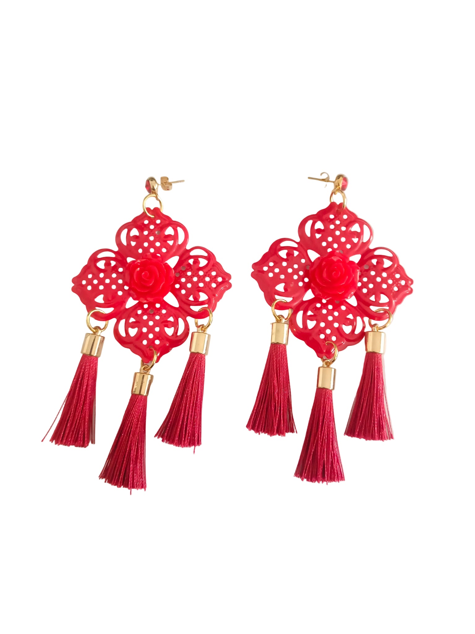 - Pendientes de metal, resina, strass y borlas de hilo rojo.