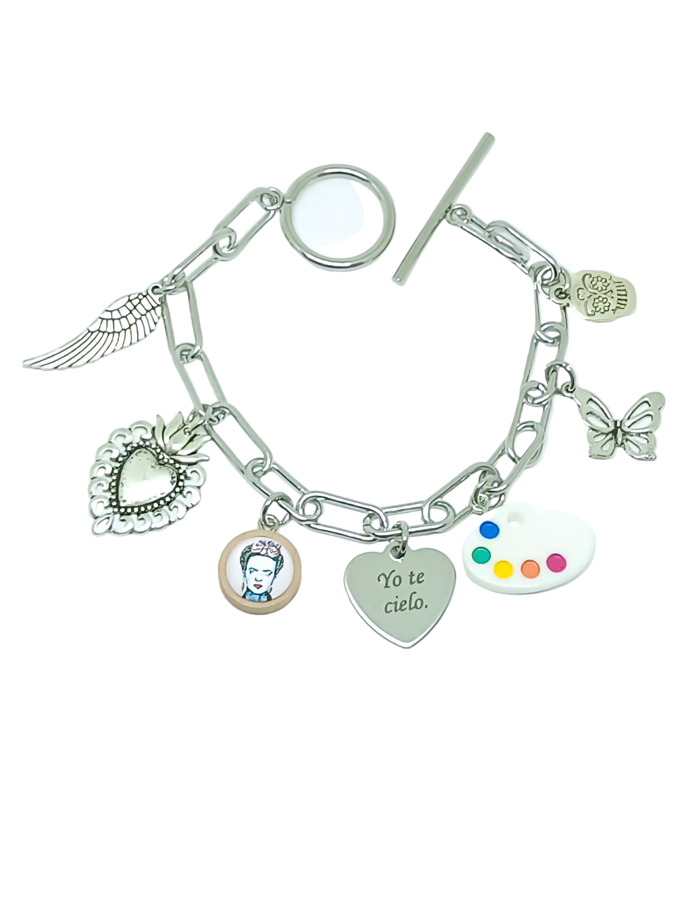 - Bracelet made of metal, resin, steel, glass, acrylic and wood with allegorical pendants to the Mexican artist Frida Kahlo.