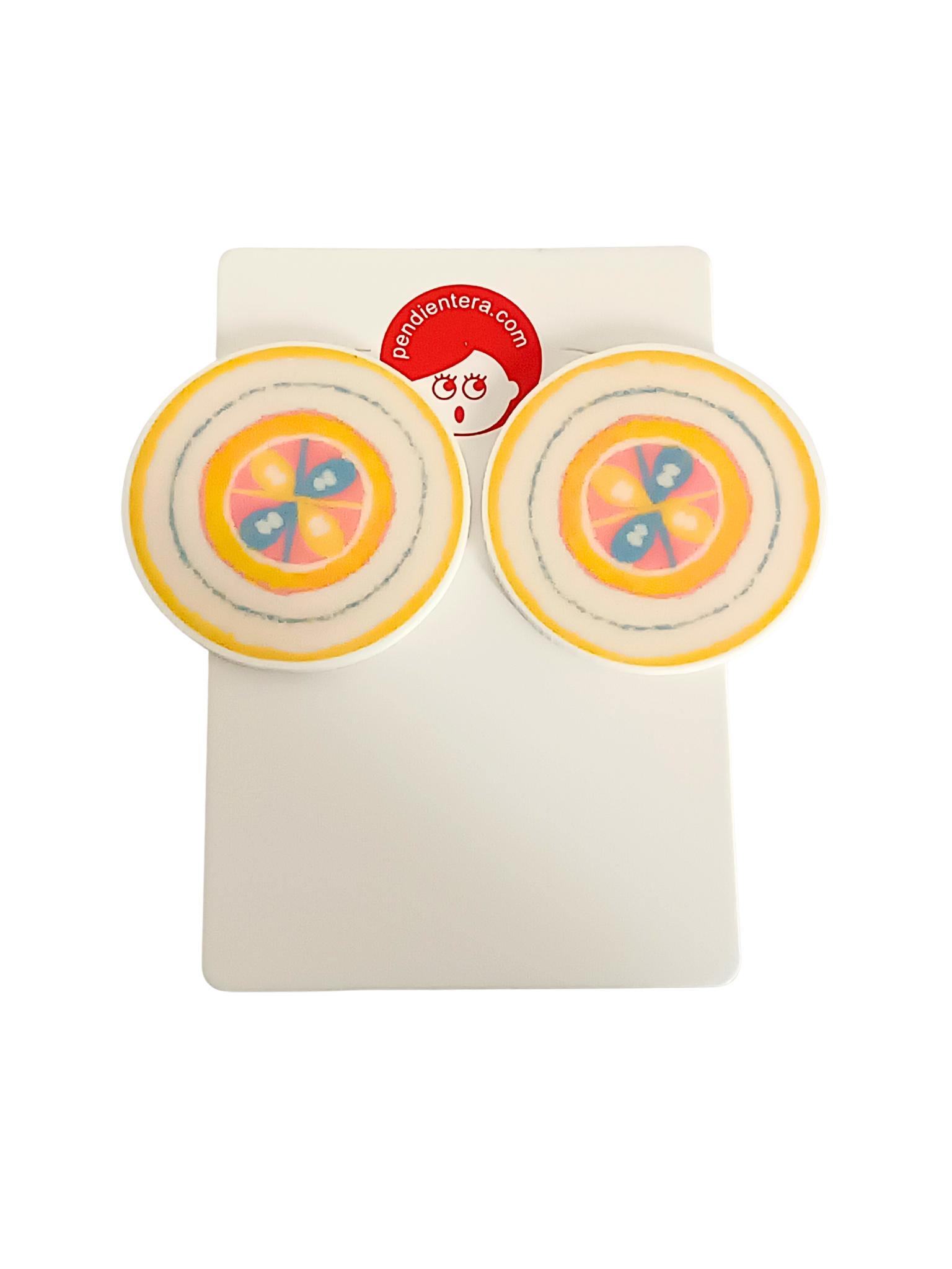 • Pendientes de metal y acrílico con ilustración Pendientera por una cara y blancos por detrás.